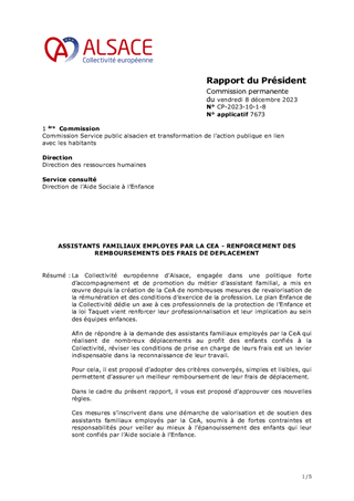 La Collectivité européenne d’Alsace, engagée dans une politique forte d’accompagnement et de promotion du métier d’assistant familial, a mis en œuvre depuis la création de la CeA de nombreuses mesures de revalorisation de la rémunération et des conditions d’exercice de la profession. Le plan Enfance de la Collectivité dédie un axe à ces professionnels de la protection de l’Enfance et la loi Taquet vient renforcer leur professionnalisation et leur implication au sein des équipes enfances. Afin de répondre à la demande des assistants familiaux employés par la CeA qui réalisent de nombreux déplacements au profit des enfants confiés à la Collectivité, réviser les conditions de prise en charge de leurs frais est un levier indispensable dans la reconnaissance de leur travail. Pour cela, il est proposé d’adopter des critères convergés, simples et lisibles, qui permettent d’assurer un meilleur remboursement de leur frais de déplacement. Dans le cadre du présent rapport, il vous est proposé d’approuver ces nouvelles règles. Ces mesures s’inscrivent dans une démarche de valorisation et de soutien des assistants familiaux employés par la CeA, soumis à de fortes contraintes et responsabilités pour veiller au mieux à l’épanouissement des enfants qui leur sont confiés par l’Aide sociale à l’Enfance.