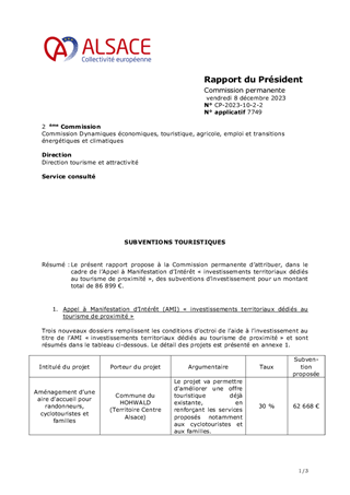 Le présent rapport propose à la Commission permanente d’attribuer, dans le cadre de l’Appel à Manifestation d’Intérêt « investissements territoriaux dédiés au tourisme de proximité », des subventions d’investissement pour un montant total de 86 899 €.