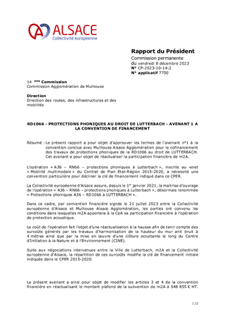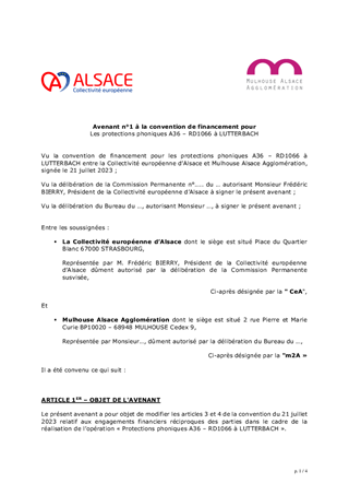 Le présent rapport a pour objet d’approuver les termes de l'avenant n°1 à la convention conclue avec Mulhouse Alsace Agglomération pour le cofinancement des travaux de protections phoniques de la RD1066 au droit de LUTTERBACH. Cet avenant a pour objet de réactualiser la participation financière de m2A.