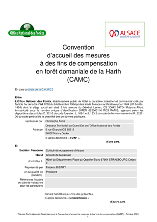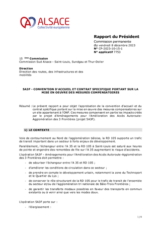 Le présent rapport a pour objet l'approbation de la convention d'accueil et du contrat spécifique portant sur la mise en œuvre des mesures compensatoires sur un site appartenant à l'ONF. Ces mesures compensent en partie les impacts créés par le projet d'Aménagements pour l'Amélioration des Accès Autoroute-Agglomération des 3 Frontières (projet 5A3F).