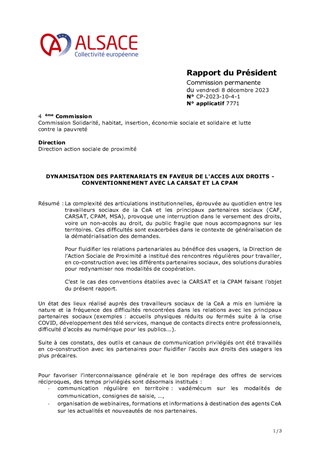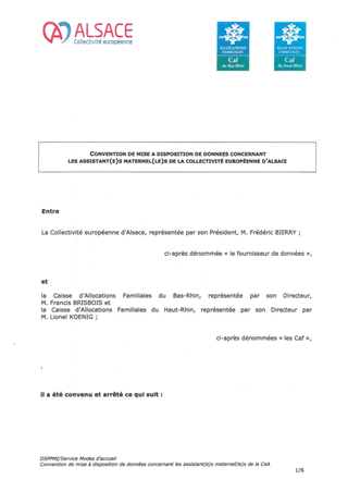 Le présent rapport propose à la Commission permanente d'approuver l'avenant n° 1 à la convention du 18 juillet 2023 qui apporte des modifications aux modalités de mise à disposition de données concernant les assistants maternels résidant sur le territoire de la CeA avec les Caisses d'allocations familiales du Bas-Rhin et du Haut-Rhin.