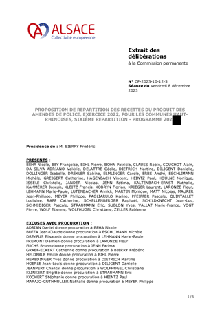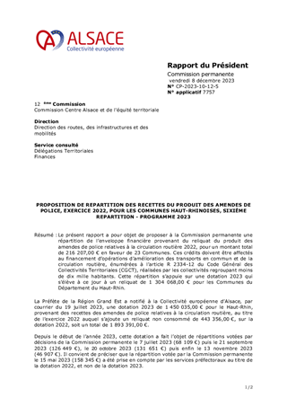 Le présent rapport a pour objet de proposer à la Commission permanente une répartition de l’enveloppe financière provenant du reliquat du produit des amendes de police relatives à la circulation routière 2022, pour un montant total de 216 207,00 € en faveur de 23 Communes. Ces crédits doivent être affectés au financement d’opérations d’amélioration des transports en commun et de la circulation routière, énumérées à l’article R 2334-12 du Code Général des Collectivités Territoriales (CGCT), réalisées par les collectivités regroupant moins de dix mille habitants. Cette répartition s’appuie sur une dotation 2023 qui s’élève à ce jour à un reliquat de 1 304 068,00 € pour les Communes du Département du Haut-Rhin.