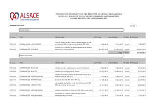 Le présent rapport a pour objet de proposer à la Commission permanente une répartition de l’enveloppe financière provenant du produit des amendes de police relatives à la circulation routière, pour un montant total de 128 484,86 € en faveur de 6 Communes : Wiwersheim, Innenheim, Niederbronn-les-Bains, Bitschhoffen, Herbsheim et Kogenheim. Ces crédits sont affectés à des opérations d’amélioration des transports en commun et de la sécurité routière réalisées par des collectivités regroupant moins de dix mille habitants.