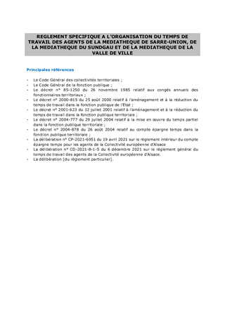 Le présent rapport a pour objet de proposer : - l'adoption d'un règlement spécifique à l'organisation du temps de travail des agents de la médiathèque de Sarre-Union, de la médiathèque du Sundgau et de la médiathèque de la Vallée de Villé ; - la communication de l'avis du Comité Social Territorial du 16 juin 2023 concernant le Rapport Social Unique de l'année 2021.