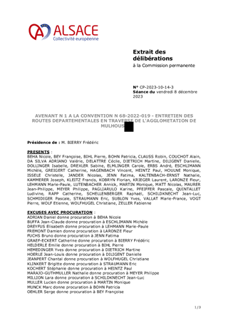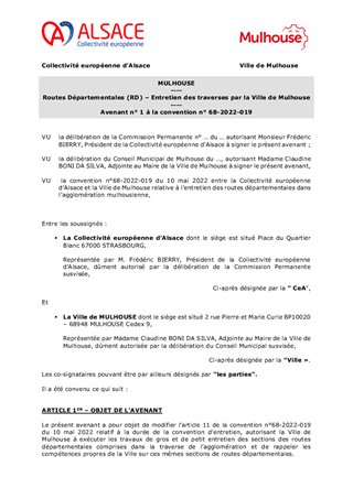 Le présent rapport a pour objet d’approuver les termes de l’avenant n°1 à la convention d’entretien des routes départementales en traverse d’agglomération n°68-2022-019, signée le 10 mai 2022 avec la Ville de MULHOUSE qui vise à proroger sa durée effective jusqu’au 31 décembre 2024, et à compter de cette date, permettre son renouvellement tacite pour une période d’une année supplémentaire, soit jusqu’au 31 décembre 2025.