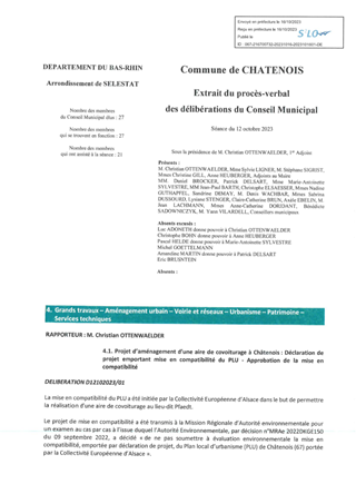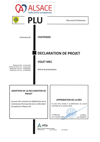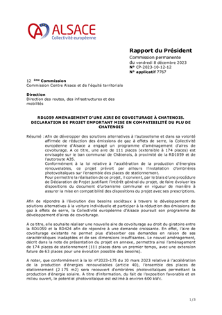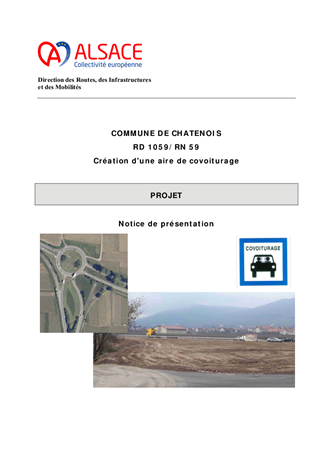 Afin de développer des solutions alternatives à l'autosolisme et dans sa volonté affirmée de réduction des émissions de gaz à effets de serre, la Collectivité européenne d'Alsace a engagé un programme d'aménagement d'aires de covoiturage. A ce titre, une aire de 111 places (extensible à 174 places) est envisagée sur le ban communal de Châtenois, à proximité de la RD1059 et de l'autoroute A35. Conformément à la loi relative à l'accélération de la production d'énergies renouvelables, ce projet prévoit par ailleurs l'installation d'ombrières photovoltaïques sur l'ensemble des places de stationnement. Pour permettre la réalisation de ce projet, il convient, par le biais d’une procédure de Déclaration de Projet justifiant l'intérêt général du projet, de faire évoluer les dispositions du document d’urbanisme communal en vigueur de manière à assurer la mise en compatibilité des dispositions du projet avec ses prescriptions.