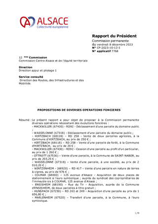 Le présent rapport a pour objet de proposer à la Commission permanente diverses opérations nécessitant des évolutions foncières : - MACKWILLER (67430) - RD92 - Déclassement d’une parcelle du domaine public ; - WASSELONNE (67318) - Déclassement d’une parcelle du domaine public ; - HIRTZBACH (68118) – RD 258 - Vente de deux parcelles agricoles, à la Commune d'HIRTZBACH, au prix de 250 € ; - HIRTZBACH (68118) – RD 258 - Vente d’une parcelle de forêt, à la Commune d'HIRTZBACH, au prix de 20 € ; - MACKWILLER (67430) - RD92 - Cession d’une parcelle au profit d’un particulier, au prix de 1 260 € ; - OTTROTT (67530) – Vente d’une parcelle, à la Commune de SAINT-NABOR, au prix de 203,25 € ; - WASSELONNE (67318) – Vente d’une parcelle, à une société, au prix de 2 010,20 € ; - WINTZENHEIM - (68920) – RD 417 – Vente d’une parcelle en nature de terres à vignes, au prix de 976 € ; - COLMAR (68000) – 125 avenue d'Alsace - Acquisition de deux places de stationnement à l’euro symbolique ; auprès du syndicat des copropriétaires de l'immeuble sis à COLMAR, 125 avenue d'Alsace ; - ENSISHEIM (68190) – Rue du Tir - Acquisition, auprès de la Commune d'ENSISHEIM, de deux parcelles à titre gratuit ; - HUNSPACH (67250) – RD 263 et 249 - Acquisition d’une parcelle au prix de 1 656,80 € ; - MARLENHEIM (67520) – Transfert d’une parcelle, à la Commune, à l’euro symbolique.