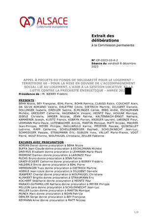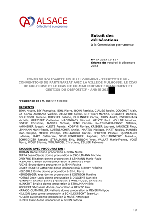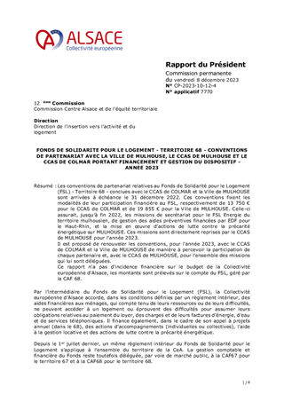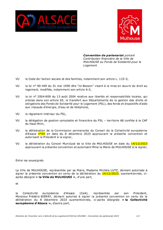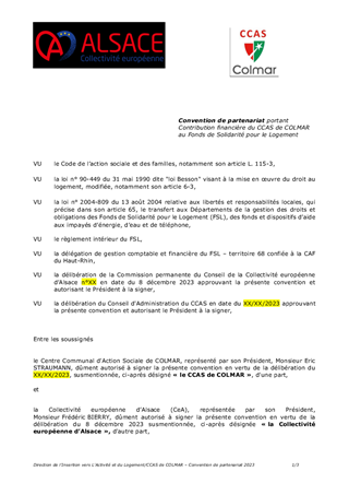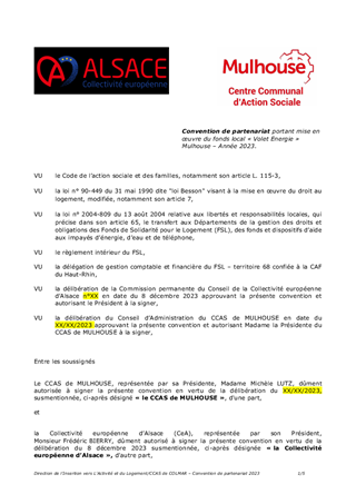 Les conventions de partenariat relatives au Fonds de Solidarité pour le Logement (FSL) - Territoire 68 - conclues avec le CCAS de COLMAR et la Ville de MULHOUSE sont arrivées à échéance le 31 décembre 2022. Ces conventions fixent les modalités de leur participation financière au FSL, respectivement de 13 750 € pour le CCAS de COLMAR et de 19 855 € pour la Ville de MULHOUSE. Celle-ci assurait, jusqu’à fin 2022, les missions de secrétariat pour le FSL Energie du territoire mulhousien, de gestion des aides préventives financées par EDF pour le Haut-Rhin, et la mise en œuvre d'actions de lutte contre la précarité énergétique sur MULHOUSE. Ces missions sont directement reprises par le CCAS de MULHOUSE pour l’année 2023. Il est proposé de renouveler les conventions, pour l'année 2023, avec le CCAS de COLMAR et la Ville de MULHOUSE de manière à percevoir la participation de chaque partenaire et, avec le CCAS de MULHOUSE, pour l’ensemble des missions qui lui sont déléguées. Ce rapport n'a pas d'incidence financière sur le budget de la Collectivité européenne d'Alsace, les montants sont prélevés sur le compte du FSL, géré par la CAF 68.