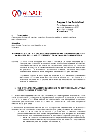 Le Fonds Social Européen Plus (FSE+) constitue un levier important de la stratégie pour l’insertion et l’emploi de la Collectivité européenne d’Alsace en complétant les crédits en faveur de l’inclusion des bénéficiaires du revenu de Solidarité active (rSa) et de la lutte contre la pauvreté des personnes en situation de précarité. La Collectivité européenne d’Alsace, reconnue Organisme Intermédiaire, bénéficie d’une délégation de crédits de la part de l’Etat. Le présent rapport a pour objet de proposer à la Commission permanente d’approuver l’octroi des aides sollicitées pour la période 2022-2025 pour 3 253 858 euros au profit de 15 projets, et de fixer les modalités de versement des avances et des soldes.