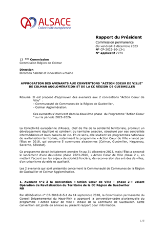 Il est proposé d'approuver des avenants aux 2 conventions "Action Coeur de Ville" : - Communauté de Communes de la Région de Guebwiller, - Colmar Agglomération. Ces avenants s'inscrivent dans la deuxième phase du Programme "Action Coeur " sur la période 2023-2026.