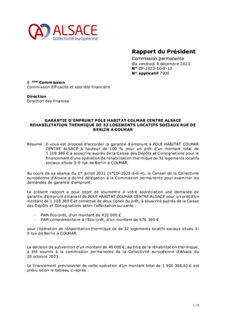 Il vous est proposé d’accorder la garantie d'emprunt à POLE HABITAT COLMAR CENTRE ALSACE à hauteur de 100 % pour un prêt d’un montant total de 1 108 389 € à souscrire auprès de la Caisse des Dépôts et Consignations pour le financement d'une opération de réhabilitation thermique de 32 logements locatifs sociaux situés 3-9 rue de Berlin à COLMAR.