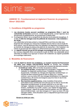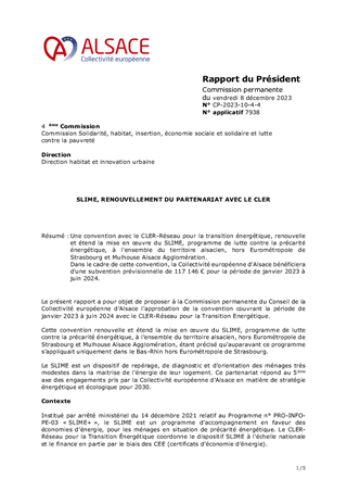 Une convention avec le CLER-Réseau pour la transition énergétique, renouvelle et étend la mise en œuvre du SLIME, programme de lutte contre la précarité énergétique, à l'ensemble du territoire alsacien, hors Eurométropole de Strasbourg et Mulhouse Alsace Agglomération. Dans le cadre de cette convention, la Collectivité européenne d'Alsace bénéficiera d'une subvention prévisionnelle de 117 146 € pour la période de janvier 2023 à juin 2024.