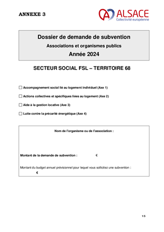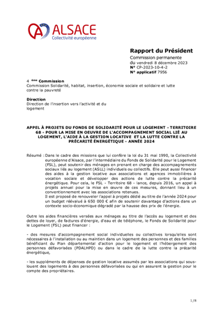 Dans le cadre des missions que lui confère la loi du 31 mai 1990, la Collectivité européenne d'Alsace, par l'intermédiaire du Fonds de Solidarité pour le Logement (FSL), peut soutenir des ménages en prenant en charge des accompagnements sociaux liés au logement (ASLL) individuels ou collectifs. Elle peut aussi financer des aides à la gestion locative aux associations et agences immobilières à vocation sociale et développer des actions de lutte contre la précarité énergétique. Pour cela, le FSL - Territoire 68 - lance, depuis 2016, un appel à projets annuel pour la mise en œuvre de ces mesures, donnant lieu à un conventionnement avec les associations retenues. Il est proposé de renouveler l'appel à projets dédié au titre de l'année 2024 pour un budget réévalué à 650 000 € afin de soutenir davantage d'actions dans un contexte socio-économique dégradé par la hausse des prix de l'énergie.