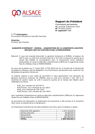 Il vous est proposé d’accorder la garantie d'emprunt à DOMIAL à hauteur de 100 % pour un prêt d’un montant total de 1 414 102 € à souscrire auprès de la Caisse des Dépôts et Consignations pour le financement d'une opération d’acquisition en vente en état futur d'achèvement (VEFA) de 12 logements situés Rue du Château d’eau à ROESCHWOOG.