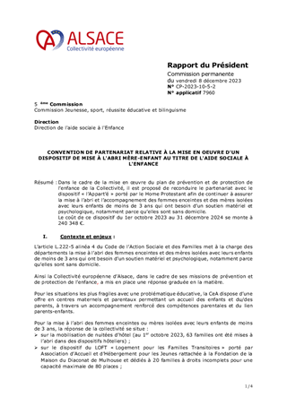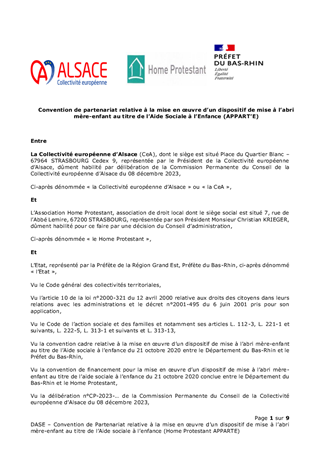 Dans le cadre de la mise en œuvre du plan de prévention et de protection de l’enfance de la Collectivité, il est proposé de reconduire le partenariat avec le dispositif « l’Appart’é » porté par le Home Protestant afin de continuer à assurer la mise à l’abri et l’accompagnement des femmes enceintes et des mères isolées avec leurs enfants de moins de 3 ans qui ont besoin d’un soutien matériel et psychologique, notamment parce qu’elles sont sans domicile. Le coût de ce dispositif du 1er octobre 2023 au 31 décembre 2024 se monte à 240 348 €.