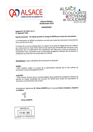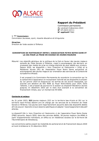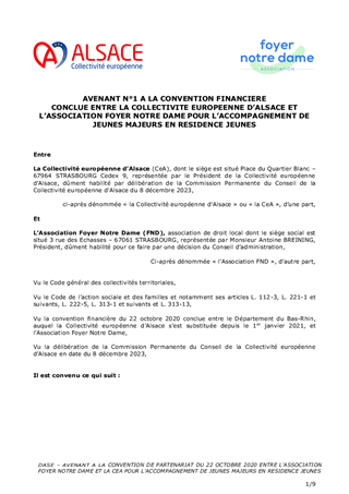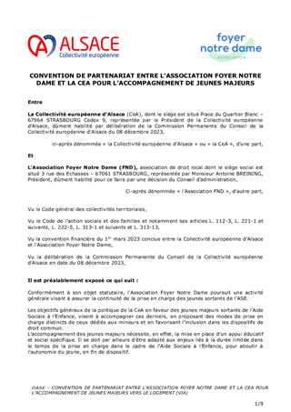 Les objectifs généraux de la politique de la CeA en faveur des jeunes majeurs sortants de l’Aide Sociale à l’Enfance, visent à accompagner ces derniers, en proposant des modes de prise en charge distincts de ceux dédiés aux mineurs. Depuis 2020, les dispositifs « Vers l’Insertion et l’Autonomie » (VIA) et la Résidence Jeunes (RJ) de l’Association Foyer Notre Dame accueillent et accompagnent des jeunes majeurs sur orientation des services de la Collectivité européenne d’Alsace. Il est proposé à la Commission Permanente de reconduire la convention qui lie la collectivité à l’association en mutualisant l’activité de ces dispositifs à compter du 1er janvier 2024 et d’approuver les termes de cet accord réactualisé, qui accorde une dotation de 642 400€ au Foyer Notre-Dame pour 2024. Dans l’attente, il est proposé de poursuivre le soutien au dispositif Résidence Jeunes jusqu’au 31 décembre 2023 par le biais d’un avenant à la convention de financement initiale, pour un montant de 49 036€.