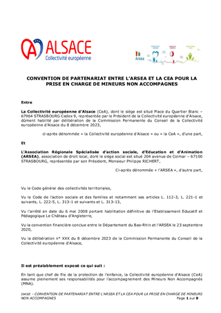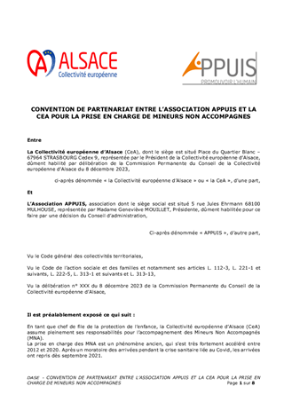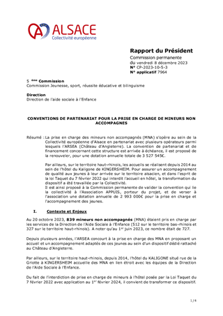 La prise en charge des mineurs non accompagnés (MNA) s’opère au sein de la Collectivité européenne d’Alsace en partenariat avec plusieurs opérateurs parmi lesquels l’ARSEA (Château d’Angleterre). La convention de partenariat et de financement concernant cette structure est arrivée à échéance, il est proposé de la renouveler, pour une dotation annuelle totale de 3 527 545€. Par ailleurs, sur le territoire haut-rhinois, les accueils se réalisent depuis 2014 au sein de l’hôtel du Kaligone de KINGERSHEIM. Pour assurer un accompagnement de qualité aux jeunes à leur arrivée sur le territoire alsacien, et dans l'esprit de la loi Taquet du 7 février 2022 qui interdit l'accueil en hôtel, la transformation du dispositif a été travaillée par la Collectivité. Il est ainsi proposé à la Commission permanente de valider la convention qui lie la collectivité à l’Association APPUIS, porteur du projet, et de verser à l'association une dotation annuelle de 2 993 000€ pour la prise en charge et l'accompagnement des jeunes.