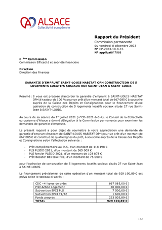 Il vous est proposé d’accorder la garantie d'emprunt à SAINT-LOUIS HABITAT OPH à hauteur de 100 % pour un prêt d’un montant total de 667 085 € à souscrire auprès de la Caisse des Dépôts et Consignations pour le financement d'une opération de construction de 5 logements locatifs sociaux situés 27 rue Saint-Jean à SAINT-LOUIS.