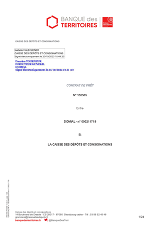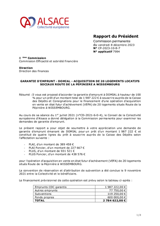 Il vous est proposé d’accorder la garantie d'emprunt à DOMIAL à hauteur de 100 % pour un prêt d’un montant total de 1 987 222 € à souscrire auprès de la Caisse des Dépôts et Consignations pour le financement d'une opération d’acquisition en vente en état futur d'achèvement (VEFA) de 20 logements situés Route de la Pépinière à WISSEMBOURG.