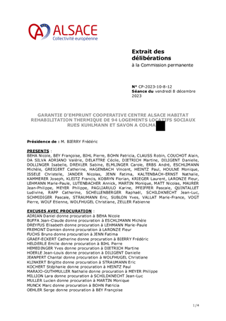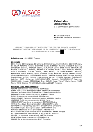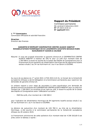 Il vous est proposé d’accorder la garantie d'emprunt à COOPERATIVE CENTRE ALSACE HABITAT à hauteur de 100 % pour un prêt d’un montant total de 1 269 000 € à souscrire auprès de la Caisse des Dépôts et Consignations pour le financement d'une opération de réhabilitation thermique de 94 logements locatifs sociaux situés 2 au 34 rue Kuhlmann et 1 au 4 rue Savon à COLMAR.