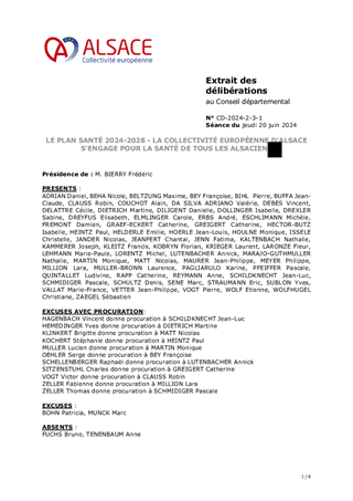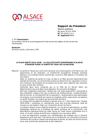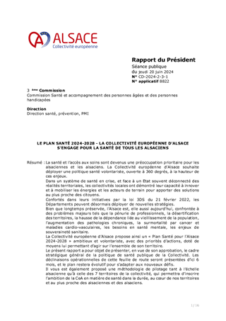 La santé et l’accès aux soins sont devenus une préoccupation prioritaire pour les alsaciennes et les alsaciens. La Collectivité européenne d’Alsace souhaite déployer une politique santé volontariste, ouverte à 360 degrés, à la hauteur de ces enjeux. Dans un système de santé en crise, et face à un Etat souvent déconnecté des réalités territoriales, les collectivités locales ont démontré leur capacité à innover et à mobiliser les énergies et les acteurs de terrain pour apporter des solutions au plus proche des citoyens. Confortés dans leurs initiatives par la loi 3DS du 21 février 2022, les Départements peuvent désormais déployer de nouvelles stratégies. Bien que longtemps préservée, l’Alsace est, elle aussi aujourd’hui, confrontée à des problèmes majeurs tels que la pénurie de professionnels, la désertification des territoires, la hausse de la dépendance liée au vieillissement de la population, l’augmentation des pathologies chroniques, la surmortalité par cancer et maladies cardio-vasculaires, les besoins en santé mentale, les enjeux de souveraineté sanitaire. La Collectivité européenne d’Alsace propose ainsi un « Plan Santé pour l’Alsace 2024-2028 » ambitieux et volontariste, avec des priorités d’actions, doté de moyens lui permettant d’agir sur l’ensemble de son territoire. Le présent rapport a pour objet de présenter, en vue de son approbation, le cadre stratégique général de la politique de santé publique de la Collectivité. Les déclinaisons opérationnelles de cette feuille de route seront présentées d’ici 6 mois, et le plan restera évolutif pour s’adapter aux nouveaux défis. Il vous est également proposé une méthodologie de pilotage tant à l’échelle alsacienne qu’à celle des 7 territoires de la collectivité, qui permettra d’inscrire l’ambition de la CeA en matière de santé dans la durée, au cœur de nos territoires et au plus proche des alsaciennes et des alsaciens.