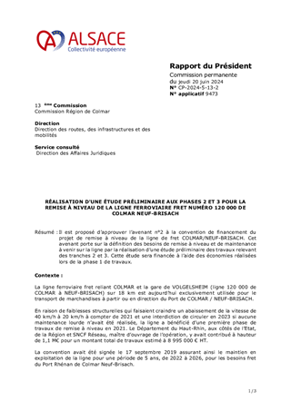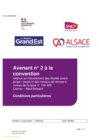 Il est proposé d’approuver l’avenant n°2 à la convention de financement du projet de remise à niveau de la ligne de fret COLMAR/NEUF-BRISACH. Cet avenant porte sur la définition des besoins de remise à niveau et de maintenance à venir sur la ligne par la réalisation d’une étude préliminaire des travaux relevant des tranches 2 et 3. Cette étude sera financée à l’aide des économies réalisées lors de la phase 1 de travaux.