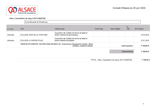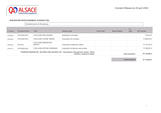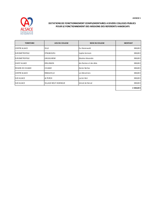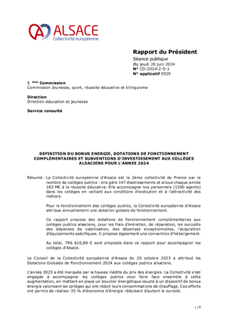 La Collectivité européenne d’Alsace est la 2ème collectivité de France par le nombre de collèges publics : elle gère 147 établissements et alloue chaque année 183 M€ à la réussite éducative. Elle accompagne nos personnels (1300 agents) dans les collèges en veillant aux conditions d’exécution et à l’attractivité des métiers. Pour le fonctionnement des collèges publics, la Collectivité européenne d’Alsace attribue annuellement une dotation globale de fonctionnement. Ce rapport propose des dotations de fonctionnement complémentaires aux collèges publics alsaciens, pour les frais d’entretien, de réparation, les surcoûts des dépenses de viabilisation, des dépenses exceptionnelles, l’acquisition d’équipements spécifiques. Il propose également une convention d’hébergement. Au total, 796 610,86 € sont proposés dans ce rapport pour accompagner les collèges d’Alsace.