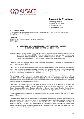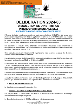 Vu les problèmes de trésorerie rencontrés par l'Entente de Lutte et d'Intervention contre les Zoonoses (ELIZ), suite aux démissions et souhaits de démission de nombreux Départements, le Conseil d'Administration de l'ELIZ a décidé de la dissolution de l'entente. Il est proposé d'approuver cette dissolution
