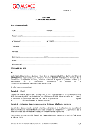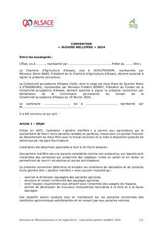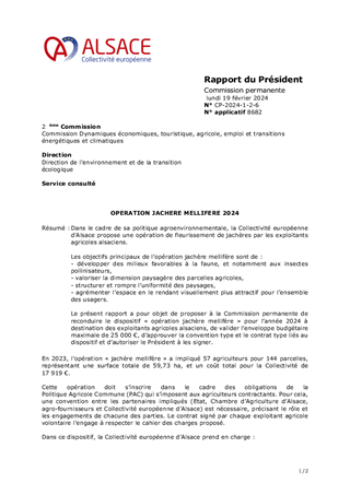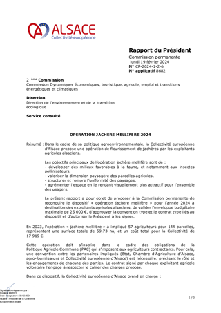 Dans le cadre de sa politique agroenvironnementale, la Collectivité européenne d’Alsace propose une opération de fleurissement de jachères par les exploitants agricoles alsaciens. Les objectifs principaux de l’opération jachère mellifère sont de : - développer des milieux favorables à la faune, et notamment aux insectes pollinisateurs, - valoriser la dimension paysagère des parcelles agricoles, - structurer et rompre l’uniformité des paysages, - agrémenter l’espace en le rendant visuellement plus attractif pour l’ensemble des usagers. Le présent rapport a pour objet de proposer à la Commission permanente de reconduire le dispositif « opération jachère mellifère » pour l’année 2024 à destination des exploitants agricoles alsaciens, de valider l’enveloppe budgétaire maximale de 25 000 €, d’approuver la convention type et le contrat type liés au dispositif et d’autoriser le Président à les signer.