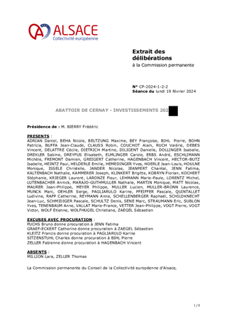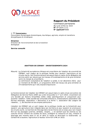 La Collectivité européenne d’Alsace est propriétaire de l’abattoir de proximité de CERNAY, outil majeur de la politique menée pour soutenir l’agriculture et les circuits courts. Son fonctionnement est assuré dans le cadre d’une délégation de service public qui stipule que les travaux d'investissements et de gros entretien sont à la charge du propriétaire. La commission consultative de l'abattoir a validé, le 1er décembre 2023, pour un montant de 40 000 €, un programme 2024 de travaux de gros entretien et d’investissements qu'il est proposé d'approuver.