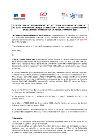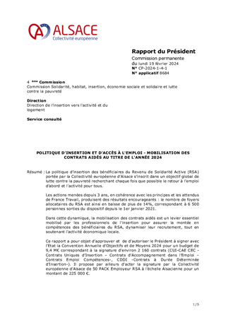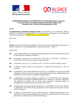 La politique d’insertion des bénéficiaires du Revenu de Solidarité Active (RSA) portée par la Collectivité européenne d’Alsace s’inscrit dans un objectif global de lutte contre la pauvreté recherchant chaque fois que possible le retour à l’emploi d’abord et l’activité pour tous. Les actions menées depuis 3 ans, en cohérence avec les principes et les attendus de France Travail, produisent des résultats encourageants : le nombre de foyers allocataires du RSA est ainsi en baisse de plus de 14%, correspondant à 6 500 personnes sorties du dispositif depuis le 1er janvier 2021. Dans cette dynamique, la mobilisation des contrats aidés est un levier essentiel mobilisé par les professionnels de l'insertion pour assurer la montée en compétences des bénéficiaires du RSA, dynamiser leur recrutement, tout en soutenant l'activité économique locale. Ce rapport a pour objet d’approuver et de d’autoriser le Président à signer avec l’Etat la Convention Annuelle d’Objectifs et de Moyens 2024 pour un budget de 9,4 M€ correspondant à la signature d’environ 2 160 contrats (CUI-CAE CEC -Contrats Uniques d’Insertion – Contrats d’Accompagnement dans l’Emploi – Contrats Emploi Compétences-, CDDI -Contrats à Durée Déterminée d’Insertion-). Il propose par ailleurs d'acter la signature par la Collectivité européenne d’Alsace de 50 PACK Employeur RSA à l’échelle Alsacienne pour un montant de 225 000 €.