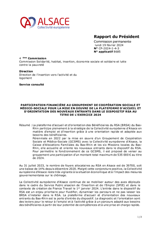 La plateforme d’accueil et d’orientation des Bénéficiaires du RSA (BRSA) du Bas-Rhin participe pleinement à la stratégie de la Collectivité européenne d’Alsace en matière d’emploi et d’insertion grâce à une orientation rapide et adaptée aux besoins des bénéficiaires. Pérennisée en 2022 par la mise en œuvre d’un Groupement de Coopération Sociale et Médico-Sociale (GCSMS) avec la Collectivité européenne d’Alsace, la Caisse d’Allocations Familiales du Bas-Rhin et les six Missions locales du Bas-Rhin, elle accueille et oriente les nouveaux entrants dans le dispositif du RSA. Pour permettre le fonctionnement de ce GCSMS, il est proposé de verser au groupement une participation d’un montant total maximum de 535 000 € au titre de 2024.