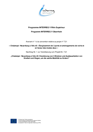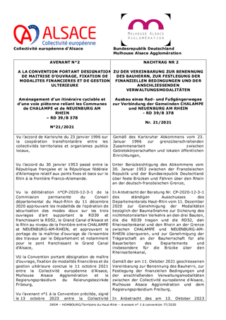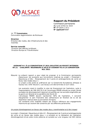 Le présent rapport a pour objet de proposer à la Commission permanente d’approuver les avenants aux conventions relatives au projet « Chalampé / Neuenburg à Vélo - Élargissement de 3 ponts et aménagements de voirie en faveur des modes doux ». Le projet a été porté et préfinancé par la Collectivité Européenne d'Alsace à hauteur de 2 876 418,02 €. Les travaux ont été terminés en avril 2022. Les avenants visent à modifier le plan de financement de l’opération, suite à l’augmentation de 306 093,76 € de l’enveloppe FEDER allouée au projet (fonds européen de développement régional) et justifiée par les surcoûts engendrés par la guerre en Ukraine et la pandémie de Covid-19. L’enveloppe FEDER devant représenter 50% de l’opération, il convient d’augmenter la part financière des cofinanceurs en fonction de la clé de répartition retenue dans la convention d’origine. Les montants ainsi modifiés restent par ailleurs inférieurs aux engagements maximums qui avaient été consentis par les différents partenaires.