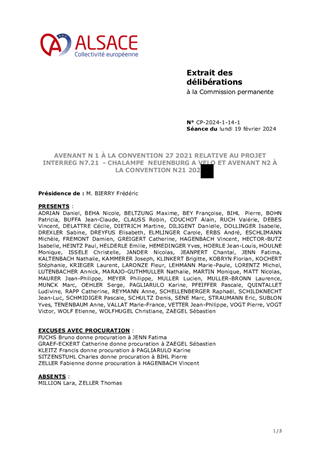 Le présent rapport a pour objet de proposer à la Commission permanente d'attribuer des subventions aux projets suivants dans le cadre du Fonds de coopération transfrontalière : - Au titre du volet d'accompagnement des projets citoyens rhénans : • Journée franco-allemande « Promouvoir l’amitié franco-allemande et la biodiversité » le 21 janvier 2024 • « Trait d'Union - Bindestrich » de mai à septembre 2024 - Au titre du volet projets d'envergure : • Projet artistique du Theater Eurodistrict BAden ALsace sur la période 2024-2026, et d’en signer la convention ; pour un montant total de 126 000 €. Le présent rapport a également pour objet la signature de la convention Interreg pour le projet « Projet de territoire Rhin supérieur ».
