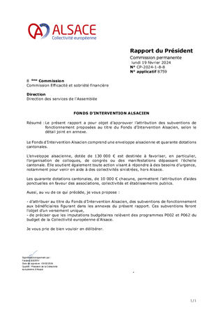 Le présent rapport a pour objet d’approuver l’attribution des subventions de fonctionnement proposées au titre du Fonds d’Intervention Alsacien, selon le détail joint en annexe.