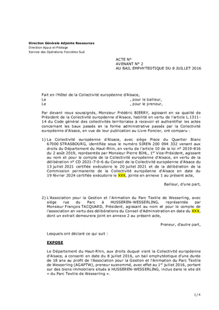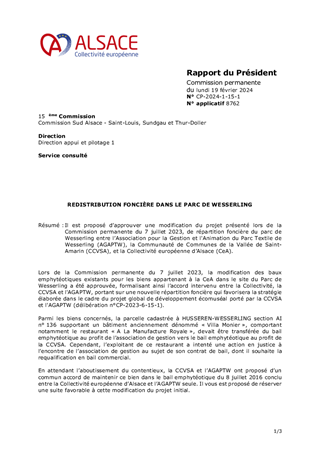 Il est proposé d’approuver une modification du projet présenté lors de la Commission permanente du 7 juillet 2023, de répartition foncière du parc de Wesserling entre l’Association pour la Gestion et l'Animation du Parc Textile de Wesserling (AGAPTW), la Communauté de Communes de la Vallée de Saint-Amarin (CCVSA), et la Collectivité européenne d’Alsace (CeA).
