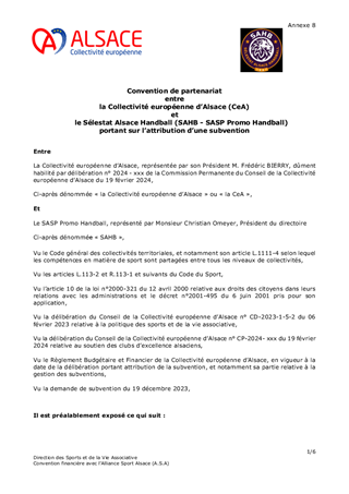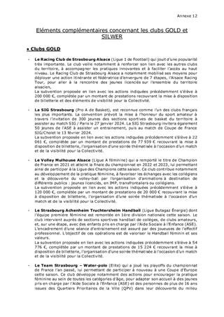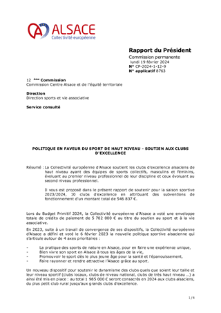 La Collectivité européenne d’Alsace soutient les clubs d'excellence alsaciens de haut niveau ayant des équipes de sports collectifs, masculins et féminins, évoluant au premier niveau professionnel de leur discipline et ceux évoluant au second niveau professionnel. Il vous est proposé dans le présent rapport de soutenir pour la saison sportive 2023/2024, 10 clubs d’excellence en attribuant des subventions de fonctionnement d'un montant total de 546 837 €.