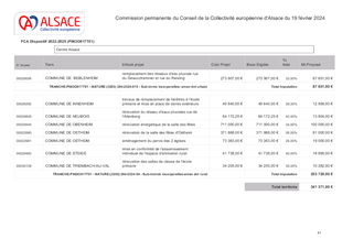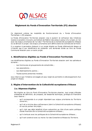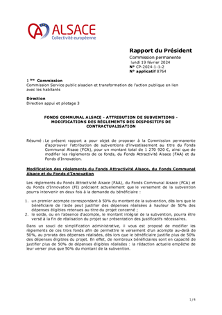 Le présent rapport a pour objet de proposer à la Commission permanente d'approuver l'attribution de subventions d'investissement au titre du Fonds Communal Alsace (FCA), pour un montant total de 1 270 920 €, ainsi que de modifier les règlements de ce fonds, du Fonds Attractivité Alsace (FAA) et du Fonds d'Innovation.
