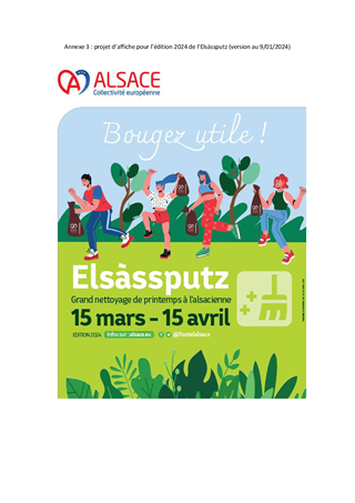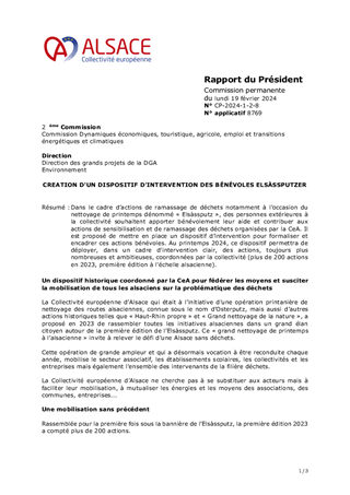 Dans le cadre d’actions de ramassage de déchets notamment à l’occasion du nettoyage de printemps dénommé « Elsàssputz », des personnes extérieures à la collectivité souhaitent apporter bénévolement leur aide et contribuer aux actions de sensibilisation et de ramassage des déchets organisées par la CeA. Il est proposé de mettre en place un dispositif d’intervention pour formaliser et encadrer ces actions bénévoles. Au printemps 2024, ce dispositif permettra de déployer, dans un cadre d'intervention clair, des actions, toujours plus nombreuses et ambitieuses, coordonnées par la collectivité (plus de 200 actions en 2023, première édition à l'échelle alsacienne).
