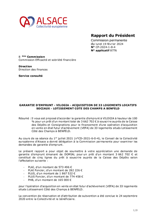 Il vous est proposé d’accorder la garantie d'emprunt à VILOGIA à hauteur de 100 % pour un prêt d’un montant total de 3 662 702 € à souscrire auprès de la Caisse des Dépôts et Consignations pour le financement d'une opération d’acquisition en vente en état futur d'achèvement (VEFA) de 33 logements situés Lotissement Côté des Champs à BENFELD.
