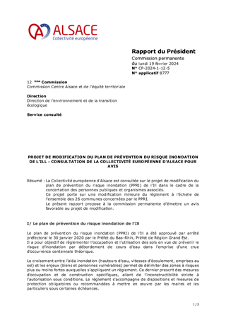 La Collectivité européenne d’Alsace est consultée sur le projet de modification du plan de prévention du risque inondation (PPRI) de l’Ill dans le cadre de la concertation des personnes publiques et organismes associés. Ce projet porte sur une modification mineure du règlement à l’échelle de l’ensemble des 26 communes concernées par le PPRI. Le présent rapport propose à la commission permanente d’émettre un avis favorable au projet de modification.