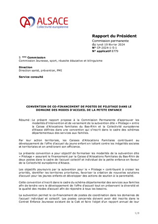 Le présent rapport propose à la Commission Permanente d’approuver les modalités d’intervention et de versement de la subvention dite « Pilotage » entre la Caisse d’Allocations familiales du Bas-Rhin et la Collectivité européenne d’Alsace définies dans une convention qui s’inscrit dans le cadre des schémas départementaux des services aux familles.