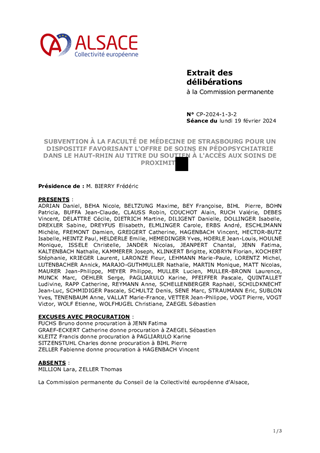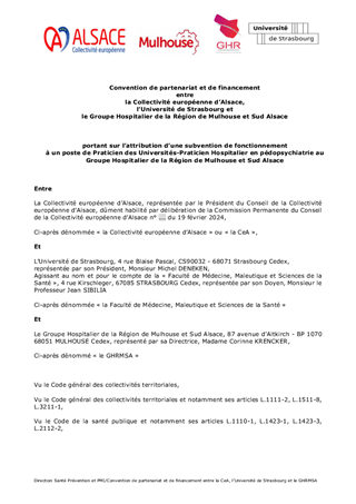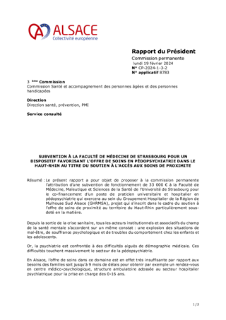 Le présent rapport a pour objet de proposer à la commission permanente l’attribution d’une subvention de fonctionnement de 33 000 € à la Faculté de Médecine, Maïeutique et Sciences de la Santé de l’Université de Strasbourg pour le co-financement d’un poste de praticien universitaire et hospitalier en pédopsychiatrie qui exercera au sein du Groupement Hospitalier de la Région de Mulhouse Sud Alsace (GHRMSA), projet qui s'inscrit dans le cadre du soutien à l’offre de soins de proximité au territoire du Haut-Rhin particulièrement sous-doté en la matière.