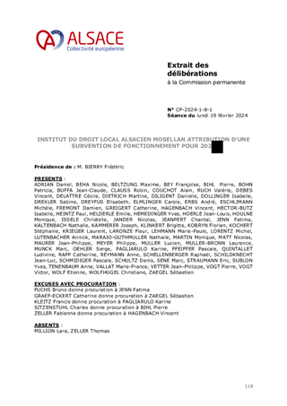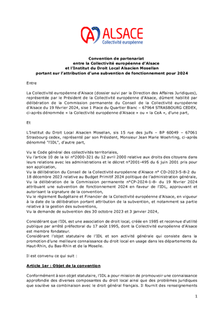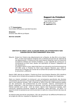 Produit de l’histoire des départements de la Moselle, du Bas-Rhin et du Haut-Rhin, le droit local alsacien-mosellan est un élément structurant de l’identité de ces départements. L'Institut du Droit Local Alsacien Mosellan, dont la Collectivité européenne d’Alsace est membre fondateur, a pour objectifs de promouvoir la connaissance du droit local, étudier son application et soutenir l’adaptation de ses dispositions. Le présent rapport a pour objet d'attribuer une subvention de fonctionnement de 125 000 euros à l'Institut du Droit Local Alsacien Mosellan pour 2024 et d'autoriser le Président du Conseil de la Collectivité européenne d'Alsace à signer la convention y afférente.