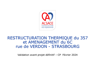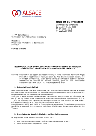 L’objectif de ce rapport est l’approbation par votre assemblée de l’Avant-Projet Définitif de l’opération de restructuration du Pôle d’Administration Sociale, rue du Verdon à Strasbourg, établi par le cabinet d’architecture IOEW de Colmar, mandataire de l’équipe de maîtrise d’œuvre, pour un coût prévisionnel d’opération de 4 840 000 €TTC, valeur septembre 2023.