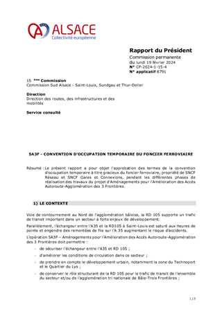 Le présent rapport a pour objet l'approbation des termes de la convention d'occupation temporaire à titre gracieux du foncier ferroviaire, propriété de SNCF Réseau et SNCF Gares et Connexions, pendant les différentes phases de réalisation des travaux du projet d'Aménagements pour l'Amélioration des Accès Autoroute-Agglomération des 3 Frontières.