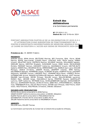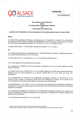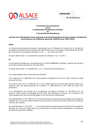 Le présent rapport a pour objet de proposer à la commission permanente d’abroger partiellement la délibération n° CP-2023-9-3-1 du 13 novembre 2023 ayant octroyé à l’Université de Strasbourg une subvention générale de fonctionnement pour l’année 2023, dans la mesure où cette subvention n’a pas pu être utilisée dans l’année de versement par ledit établissement public. Par conséquent, il est proposé d’attribuer une nouvelle subvention de fonctionnement d’un montant de 50 000 euros, fléchée sur la création de deux postes d’assistants universitaires de médecine générale et de formaliser ce partenariat entre la Collectivité européenne d’Alsace et l’Université de Strasbourg par la conclusion d’une convention idoine.