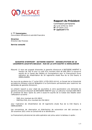 Il vous est proposé d’accorder la garantie d'emprunt à BATIGERE HABITAT à hauteur de 100 % pour un prêt d’un montant total de 685 000 € à souscrire auprès de la Caisse des Dépôts et Consignations pour le financement d'une opération de réhabilitation de 18 logements situés Rue de la Cité Dautry à HERRLISHEIM.