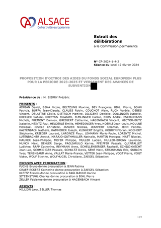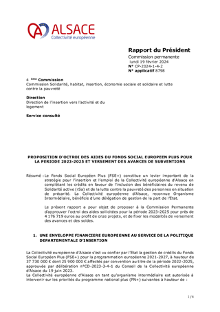 Le Fonds Social Européen Plus (FSE+) constitue un levier important de la stratégie pour l’insertion et l’emploi de la Collectivité européenne d’Alsace en complétant les crédits en faveur de l’inclusion des bénéficiaires du revenu de Solidarité active (rSa) et de la lutte contre la pauvreté des personnes en situation de précarité. La Collectivité européenne d’Alsace, reconnue Organisme Intermédiaire, bénéficie d’une délégation de gestion de la part de l’Etat. Le présent rapport a pour objet de proposer à la Commission Permanente d’approuver l’octroi des aides sollicitées pour la période 2023-2025 pour près de 4 176 719 euros au profit de onze projets, et de fixer les modalités de versement des avances et des soldes.