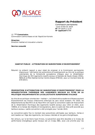 Le présent rapport a pour objet de proposer à la Commission permanente d'approuver l'attribution de subventions d'investissement au titre de la politique volontariste de la Collectivité européenne d'Alsace pour la réhabilitation thermique de 454 logements locatifs sociaux à Habitats de Haute-Alsace (HHA), NEOLIA et Pôle Habitat Colmar Centre Alsace (PHCCA) pour un montant total de 678 640 €.